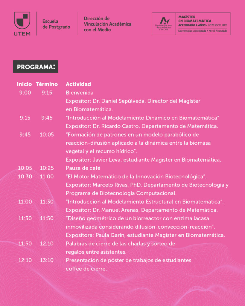 El Magíster en Biomatemática de la Universidad Tecnológica Metropolitana (UTEM), en colaboración con la Escuela de Postgrado y la Dirección de Vinculación Académica con el Medio, les invitan cordialmente a la Jornada de Modelamiento Matemático de Sistemas Biológicos 2025, que contará con presentaciones de destacados/as investigadores/as y estudiantes del programa.